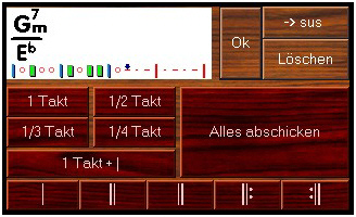 Man kann sowohl einzelne Akkordsymbole, als auch Akkordreihen von maximal 4 Takten kopieren. Mit dem Schalter "OK" kopiert man das aktuelle Akkordsymbol an die jeweilige Cursorposition. Mit dem Schalter "Alles abschicken" kopiert man die Akkordreihe inklusiv der Taktstriche in die Zeile in der der Cursor steht.