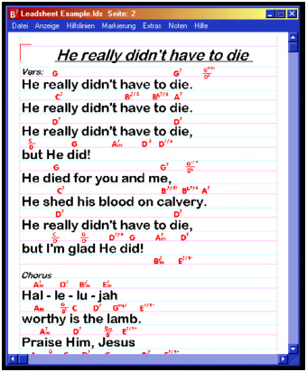 Im "Leadsheet"-Fenster können Harmonien Texte und Noten erstellt und positioniert werden.