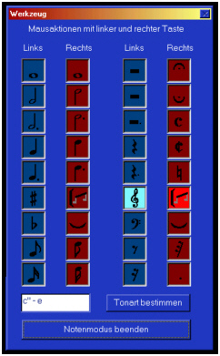Mit Eröffnung des Notenmodus erscheint rechts ein Fenster, in dem man wählen kann, welche Aktion bei Betätigung einer Maustaste geschieht. Es gibt zwei alternative