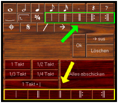 ACHTUNG: Die grün umrahmten Taktstriche sind im Gegensatz zu den weiter unten dargestellten gelb umrahmten Taktstrichen (im dritten Block) reine Zeichen. Sie werden nach Bedarf an die Cursorposition kopiert. Im Gegensatz dazu dienen die gelb umrahmten Taktstriche dazu einen neuen Takt in einer Harmoniereihe aufzurufen. Sie erscheinen erst als Zeichen, wenn die ganze Harmoniereihe übertragen wird.